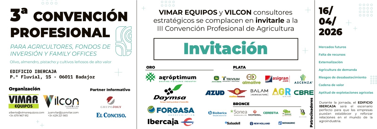 Asistiremos a la 3era Convención Profesional para Agricultores, Fondos de Inversión y Family Offices que se celebrará el 16 de Abril 2026 en el Edificio Ibercaja, Badajoz.